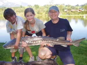 Da die Störe in den vergangenen Saisonen schon oftmals mit Schonhaken geangelt wurden, kennt der Angelteichbetreiber einige seiner Störe genau und hat ihnen auch Namen gegeben. Sein absoluter Lieblings-Stör ist der „Sträfling“ – der an seinen Streifen am Rücken sofort zu erkennen ist. Doch keineswegs sind nur Störe in ausreichender Menge im Besatz. Nach verschiedensten Forellenarten, Karpfen, Schleien, Hechte, Huchen, Zander, Welse und was das Anglerherz begehrt kann gefischt werden. Für Kinder ist das Erlebnis selbst einen Fisch zu fangen eine große Herausforderung. Ein Stör ist da die Krönung.